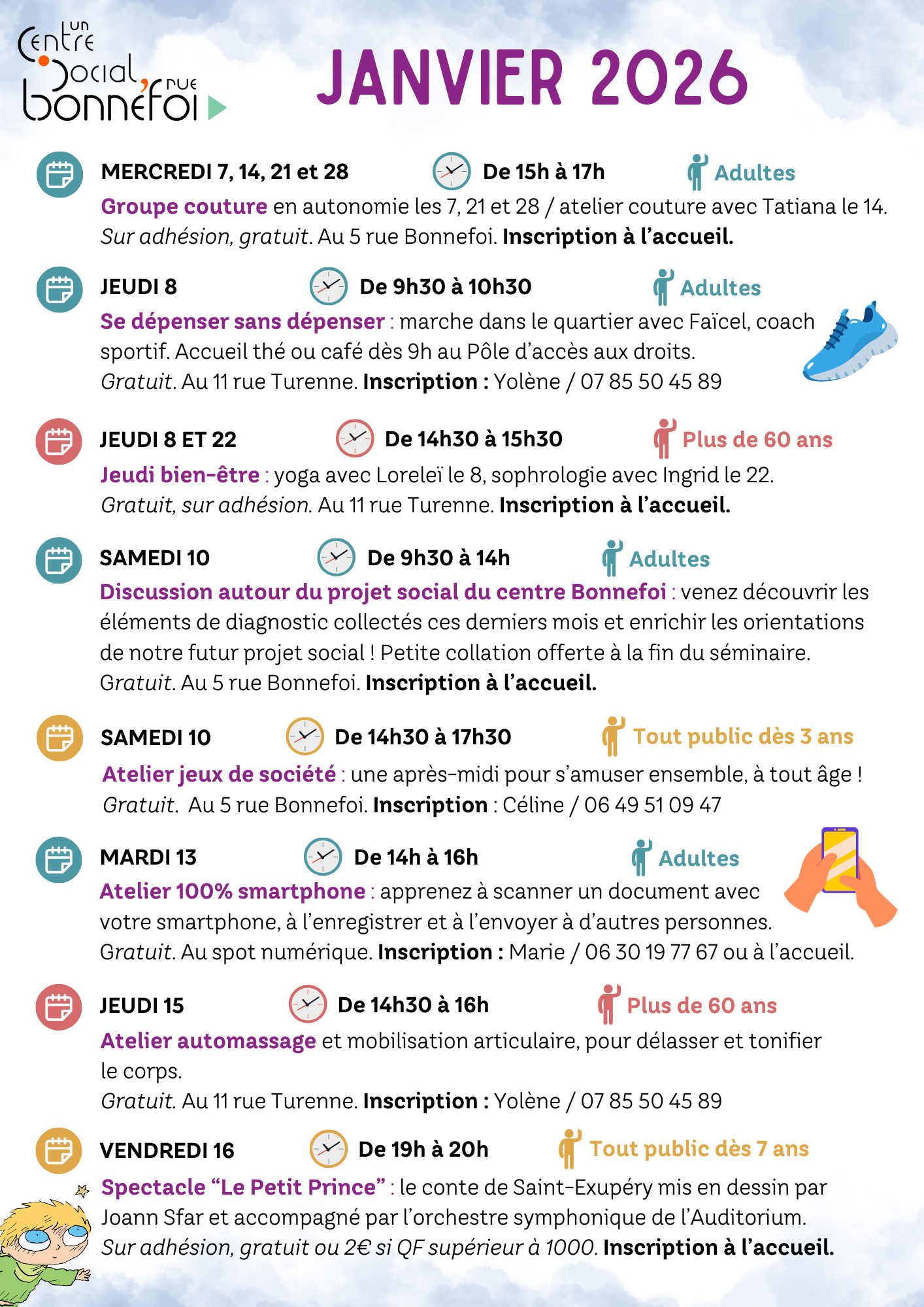 Chaque mois, le Centre social Bonnefoi vous propose son programme mensuel. Laissez-vous tenter par nos rendez-vous de janvier !